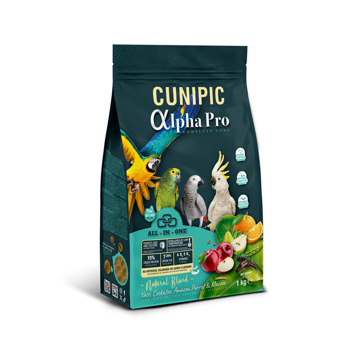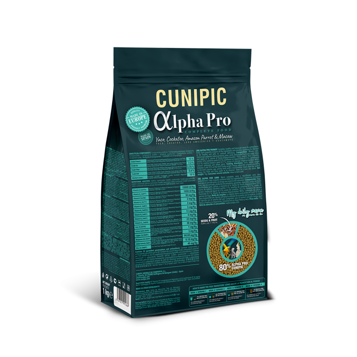 Detalles del ProductoAlpha Pro – Alimento para Loros natural 1kgMenu´ completo, sano y equilibrado para aves psitaciformes. Cada croqueta contiene todos los ingredientes y vitaminas necesariasAlpha Pro Loros – Natural Blend es un pienso basado en el innovador sistema de alimentación “All in One”, donde cada croqueta extrusionada a muy baja temperatura conserva todos los nutrientes esenciales en una mezcla homogénea. Gracias a este sistema, tu loro no podrá seleccionar únicamente las croquetas que más le gustan, evitando carencias alimenticias y asegurando una dieta completa en cada bocado.¡Tu loro siempre saludable!Ellos son más que mascotas, son parte de la familia, y cuidar de su salud es nuestra prioridad. Para mantener a tu loro sano, fuerte y lleno de vitalidad, es imprescindible proporcionarle una alimentación equilibrada. Alpha Pro Loros – Natural Blend ofrece ventajas únicas:Extrusión a baja temperatura, que preserva los nutrientes y propiedades esenciales de cada ingrediente.Croquetas uniformes y homogéneas, asegurando una nutrición completa en cada porción.Bajo contenido en grasas, ideal para controlar el peso sin comprometer la energía.Beneficios clave del producto:Salud Digestiva: Rico en fibras naturales y prebióticos que mantienen el equilibrio intestinal.Rico en ácidos grasos esenciales Omega 3, 6 y 9: Favorecen la salud cardiovascular, fortalecen los huesos y reducen el estrés en aves enjauladas.Sin azúcares añadidos ni colorantes artificiales, lo que garantiza una dieta saludable y segura.Aporte de antioxidantes naturales: Ayuda a prevenir enfermedades y promueve una vida activa y longeva.Frescura garantizadaEl producto está envasado en atmósfera modificada para conservar su frescura y mantener intactas las propiedades nutricionales desde el primer hasta el último bocado.Ingredientes principales:Frutas deshidratadas: Ricas en vitaminas y fibra.Trigo y maíz: Fuentes de energía y antioxidantes.Insectos: Proteínas de alta calidad que replican la dieta natural de los loros.Recomendaciones de usoOfrece Alpha Pro Loros – Natural Blend como alimento principal. Asegúrate de que tu loro tenga acceso a agua fresca constantemente.