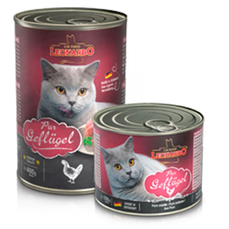 Leonardo Rico en Aves de CorralAlimento húmedo para gatos adultos elaborado con ingredientes 100% naturales de gran calidad.Quality SelectionCalidad al gusto de su gatoTamaño de envase:200 g Características del producto:Los gatos, al igual que los felinos que viven en el medio natural, son carnívoros. Este es el por qué solamente se utilizan productos cárnicos frescos. Gracias a la alta disponibilidad biológica y a la alta calidad de estos productos, su gato necesita una cantidad relativamente pequeña para satisfacer sus necesidades nutricionales diarias.Ave puraComposición: carne y derivados animales (65 % ave + caldo de ave 34 %); minerales (1 %)Análisis de los componentes: proteínas 10,0 %; contenido de grasa 5,0 %; cenizas brutas 2,0 %; fibras brutas 0,3 %; humedad 80 %Aditivos por kg: Aditivos nutricionales: vitamina D3 200 UI; vitamina E 50 mg; taurina 1.000 mg; manganeso (como sulfato de manganeso II) 2 mg; zinc (como sulfato de zinc, monohidrato) 20 mg; yodo (como yodato cálcico, sin agua) 0,2 mg