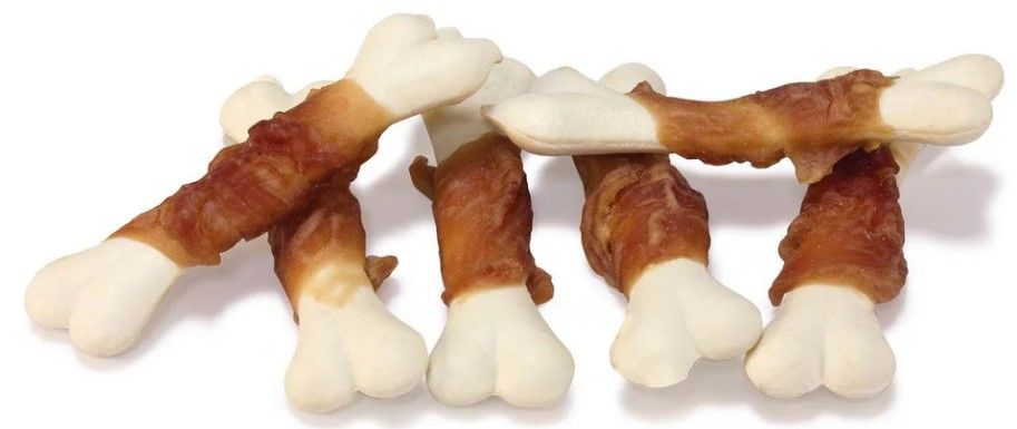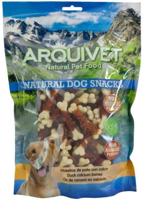 Snack en forma de huesitos con carne de pato enrollada. 100% natural. Con un alto contenido en proteína animal y con pocas grasas (Producto Light). Alimento complementario para tu perro, con aportación extra del calcio, muy rico en nutrientes.
